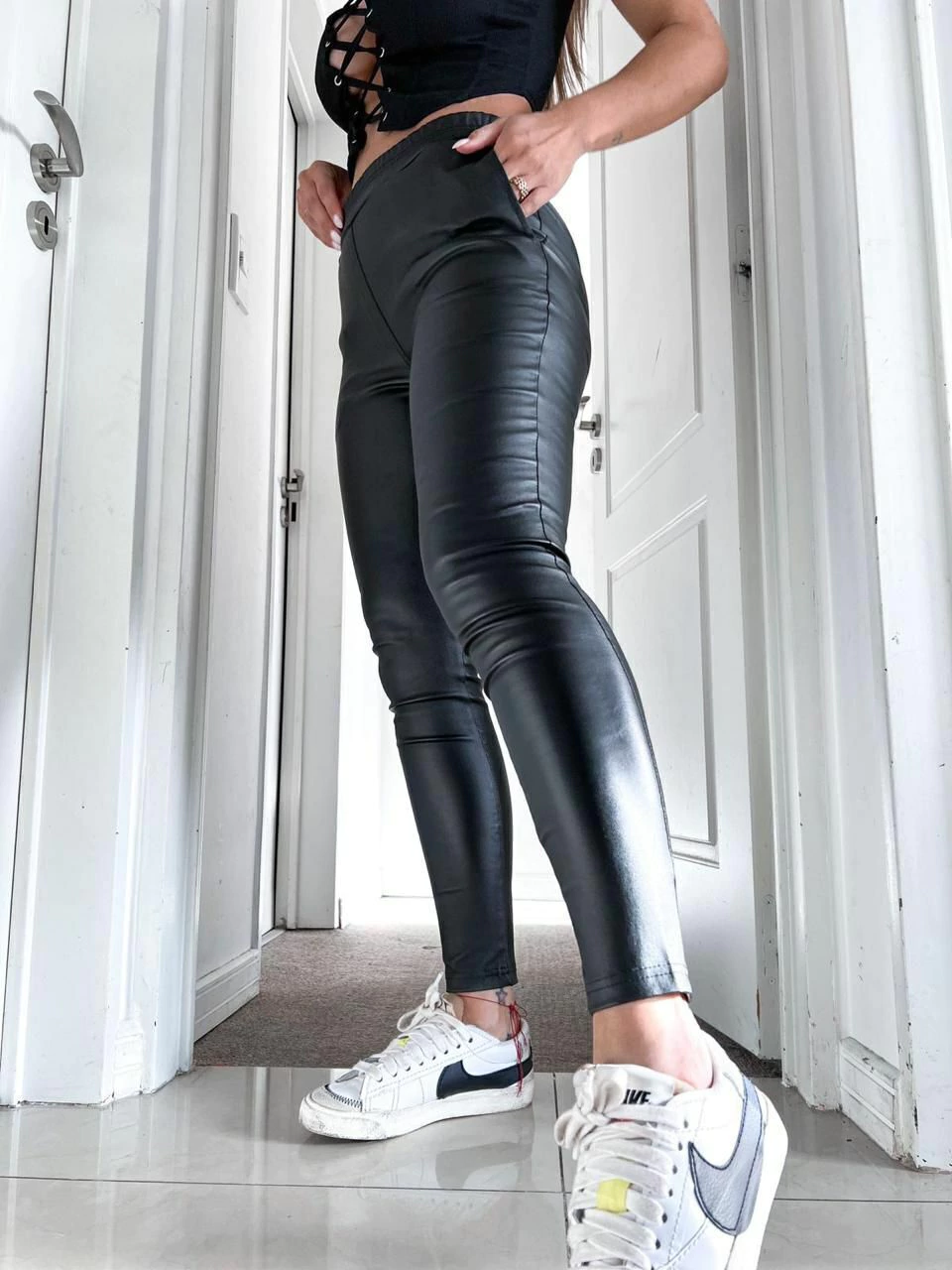 Confeccionados en material engomado de primera calidad, estos leggins ofrecen un acabado moderno y resistente, ideales para quienes buscan estilo y comodidad en un solo producto.
